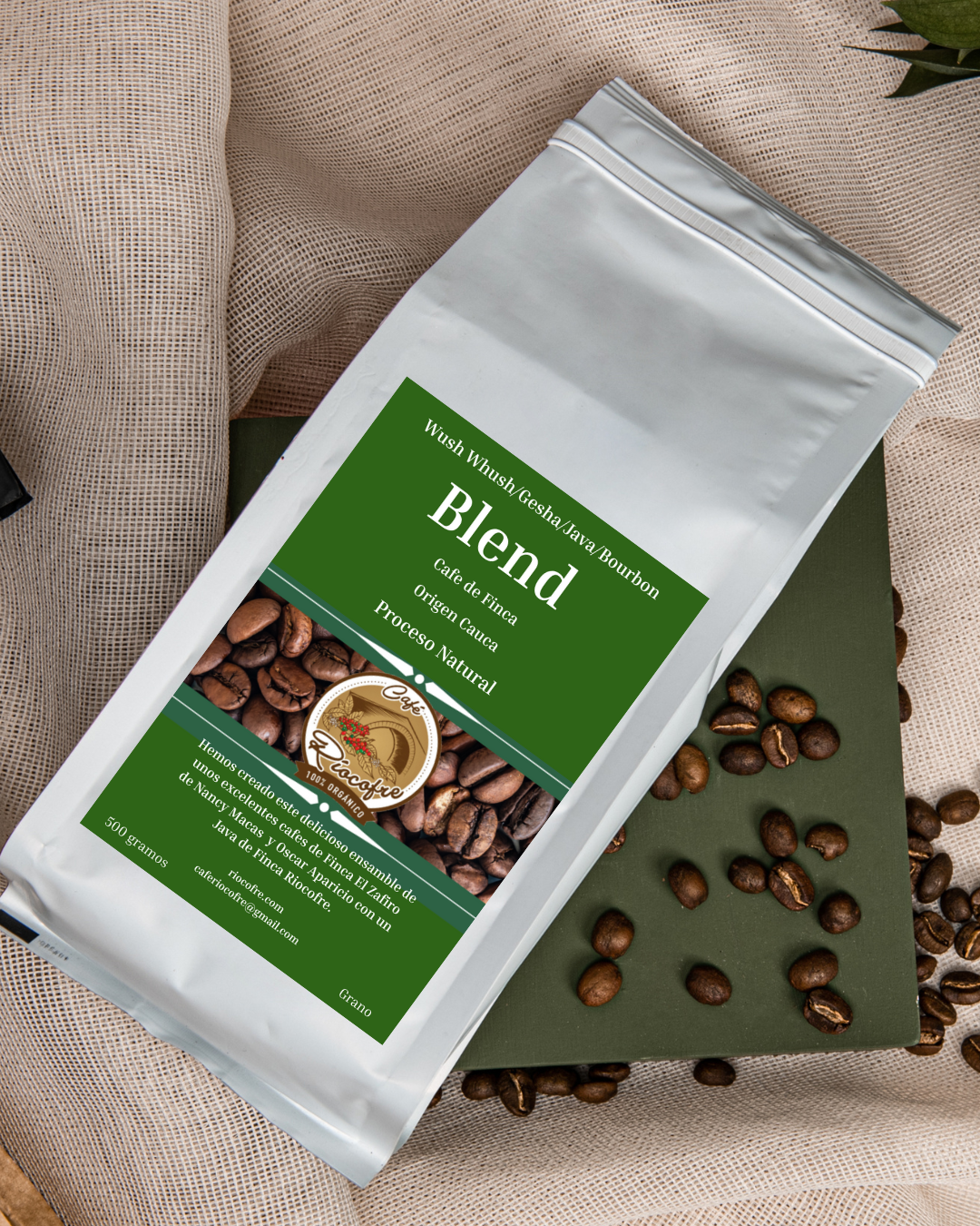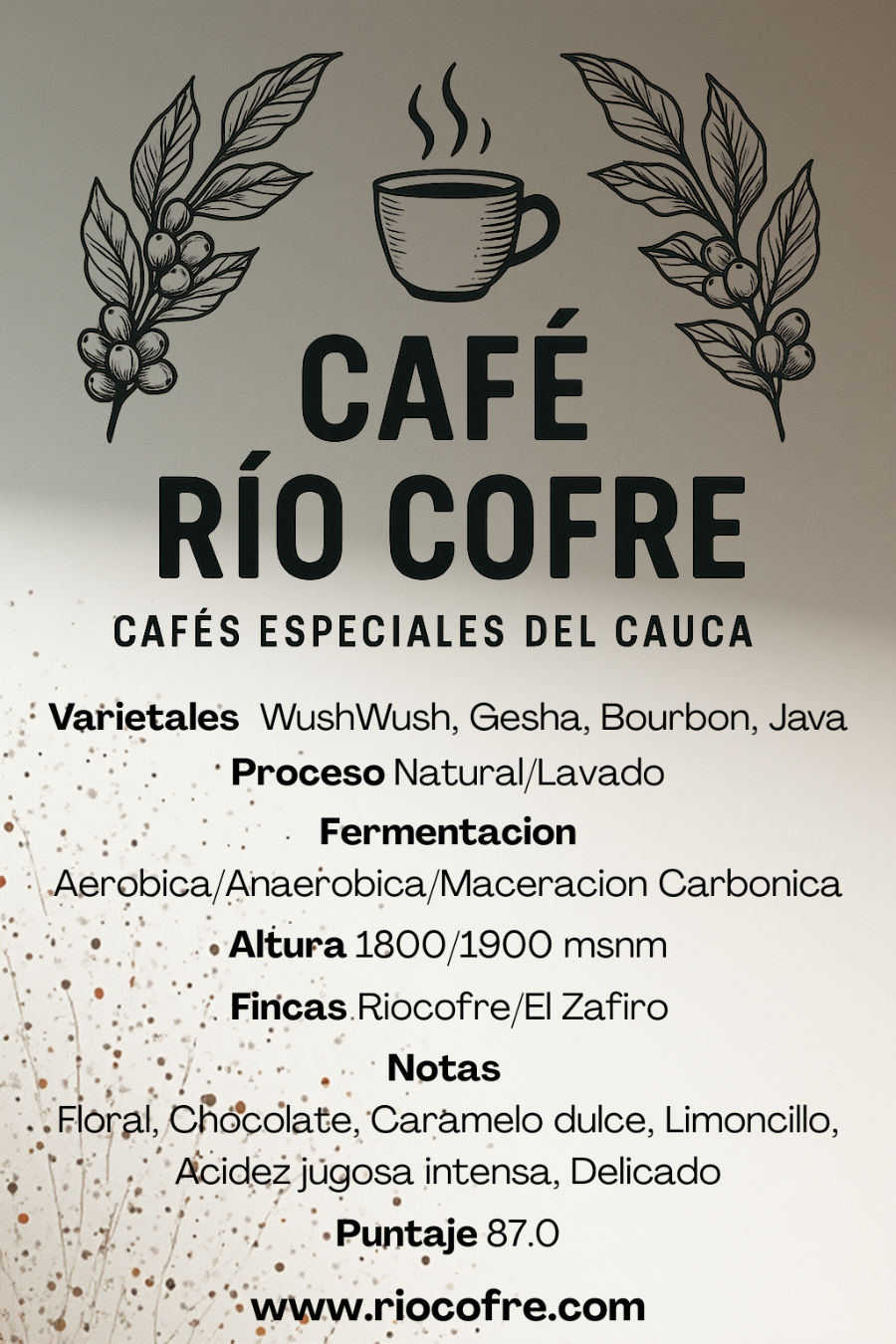 Hemos creado este ensamble de unos cafes de nuestra Finca Riocofre y de Finca El Zafiro. Combinando 4 variedades: Wush-Wush, Gesha, Bourbon y Java. Su resultado un cafe sensacional.